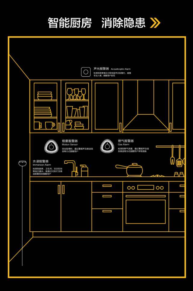 漏水滲水、有毒有害氣體、煙霧超標是家庭廚房需要預防的三大危機,合芯力量在廚房布局水浸報警器、燃氣報警器、煙霧報警器、聲光報警器,并聯動相關控制閥門,在感應到水浸、燃氣泄漏、煙霧超標等異常情況時,發出閃光、警鳴、手機APP通知三重報警,提醒用戶規避危險、采取應急措施,同時自動關閉相關閥門防止險情加劇,打開屋內窗戶窗簾減輕險情程度。
