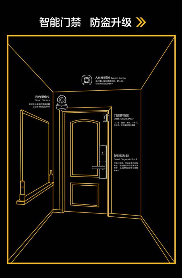 云臺攝像頭實時監控指定區域,允許手機隨時隨地查看、記錄、調用現場錄像。智能指紋鎖、人體傳感器、門窗傳感器聯動,每一次通過指紋、密碼開鎖都會及時推送手機APP提醒,開門方式、開門時間、進門人身份等信息全面顯示,遭遇撬鎖等異常情況立刻發送提醒。