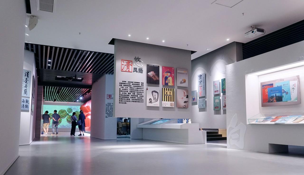 利用大型場景搭建+多媒體技術,呈現震撼大氣、引人注意的展示效果。以清遠綠水青山特色景色為設計靈感搭建舞臺,通過多媒體展示廉潔文化“六進”、廉潔文化基地印象巡展;清遠民間廉潔人物、故事、歌曲、舞蹈、物品介紹等。以清遠青山綠水與清遠政治生態風清氣正相融合,呼應第二展廳展示內容。